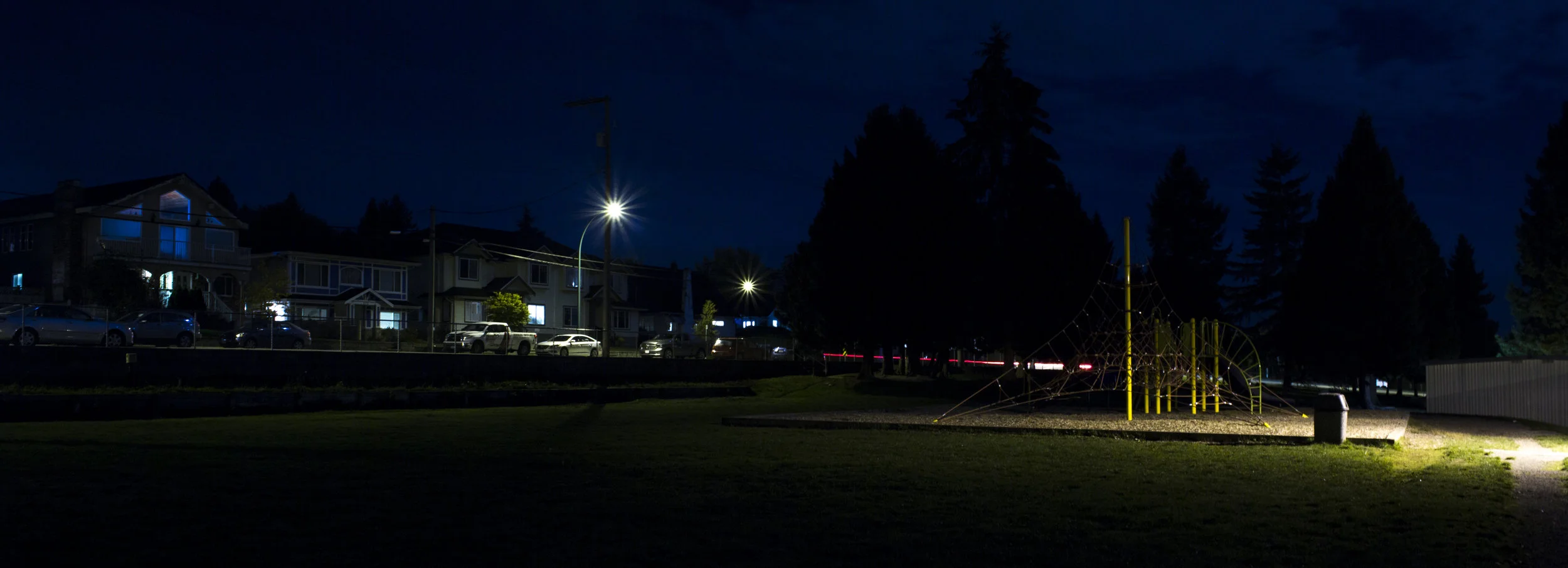 Our built environment has hidden due to our society and obsession with property and ownership, they there is clear separation between everything. I think that is how humans have created areas where they can be safe and invisible. However I feel that the light then brings back visibility of something living, the light allows us to imagine life, and ctivities inside those houses.